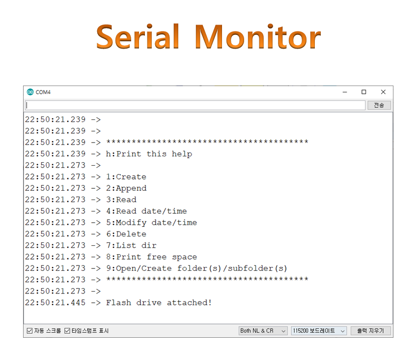 아래 처럼 USB 디스크를 삽입하면 Flash drive attached! 디버그문이 나와야 정상적으로 usb disk를 인식한 겁니다.