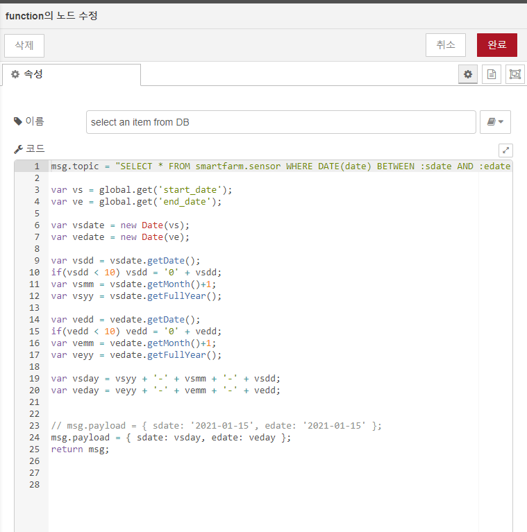 msg.topic = "SELECT * FROM smartfarm.sensor WHERE DATE(date) BETWEEN :sdate AND :edate order by ID desc limit 100;";