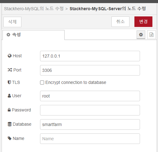 node-red-contrib-stackhero-mysql 노드를 이용하여 MariaDB에 접속합니다.