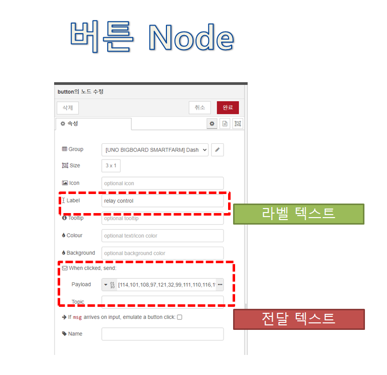버튼을 누르면 문자열 명령어를 다음 노드로 전송합니다.