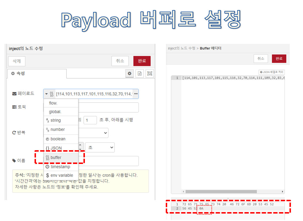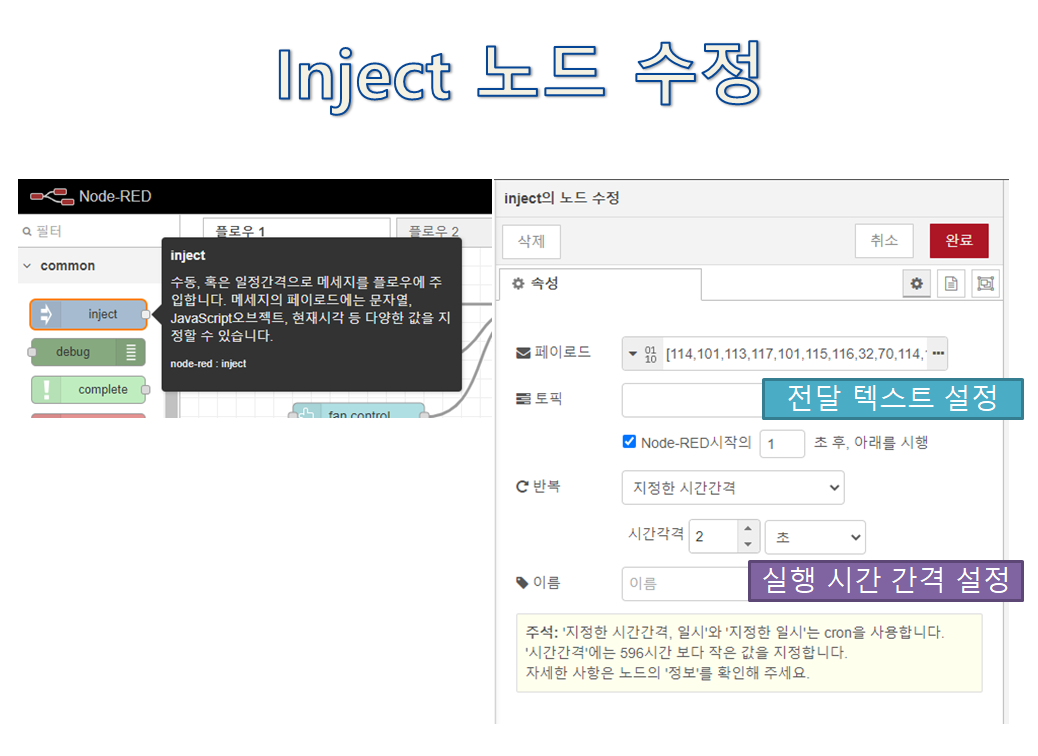 Inject 노드에 텍스트와 전달 시간 간격을 설정합니다.