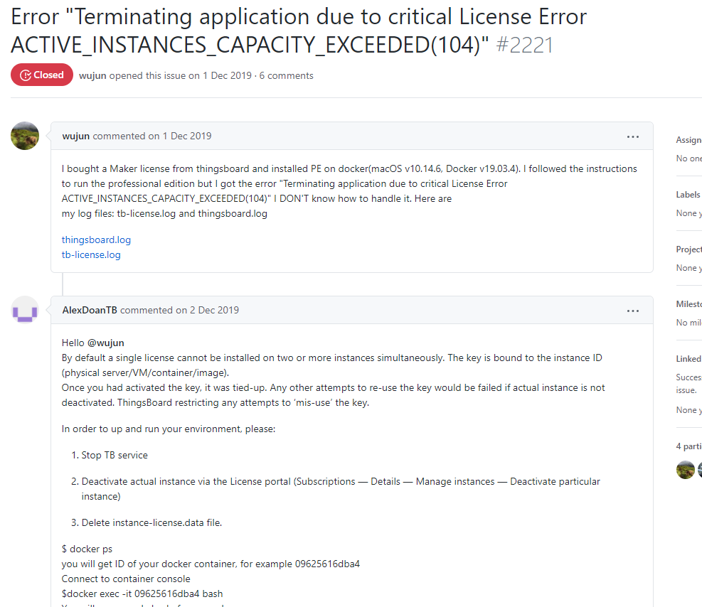Error "Terminating application due to critical License Error ACTIVE_INSTANCES_CAPACITY_EXCEEDED(104)" · Issue #2221 · thingsbo