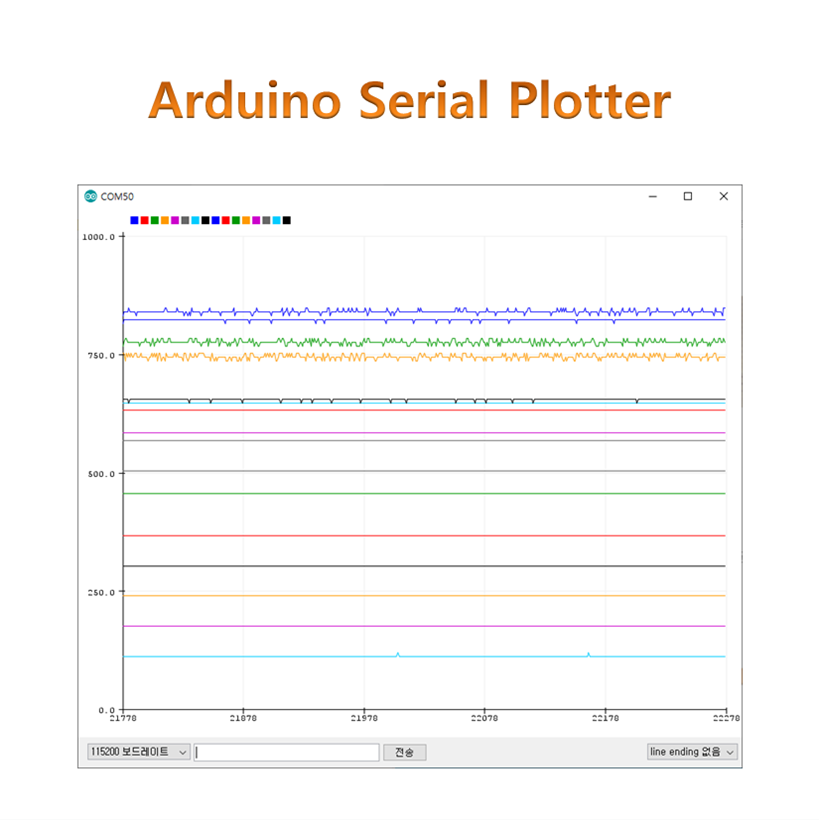 각 가변저항에서 아날로그값의 변화를 아두이노 시리얼 플로터를 이용하여 그래프로 표시합니다.