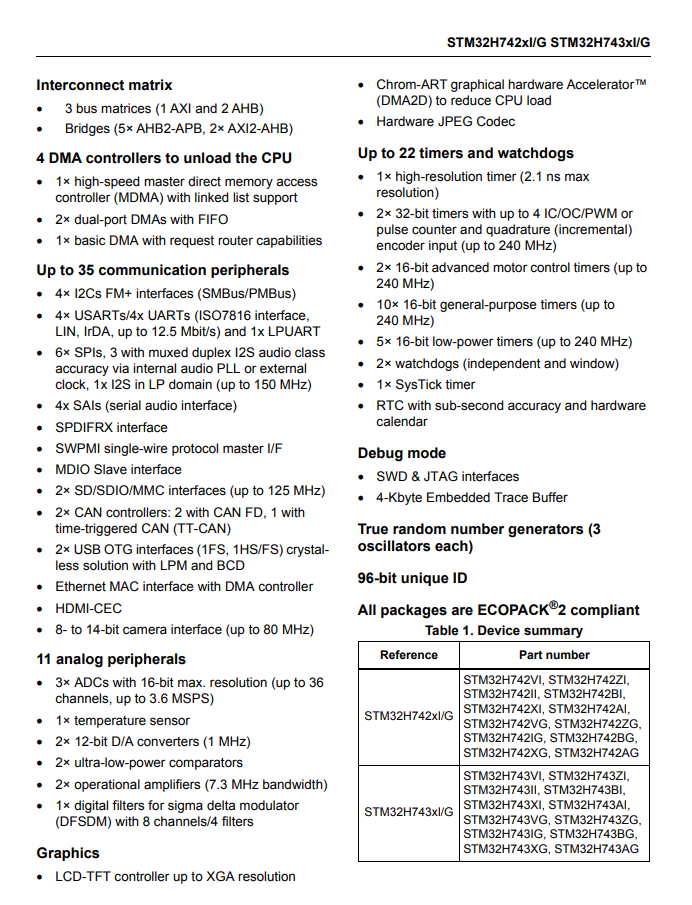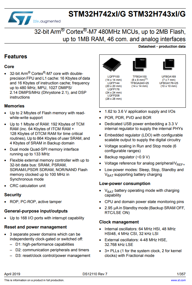 32-bit Arm® Cortex®-M7 480MHz MCUs, up to 2MB Flash, up to 1MB RAM, 46 com. and analog interfaces