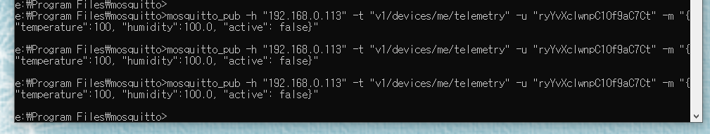 mosquitto_pub -h "192.168.0.113" -t "v1/devices/me/telemetry" -u "ryYvXcIwnpC10f9aC7Ct" -m "{"temperature":100, "humidity":100.0, "active": false}"
