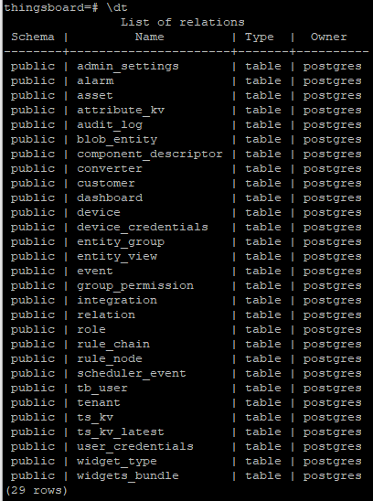 Ask questionsClean up Thingsboard database The size of thingsboard database is increasing continuously. Old data should be wipe out from time to time. DDorch/ScadaSupAgro Answer questions Data are available through a postgreSQL database. Thanks to https://