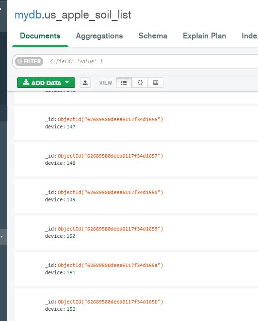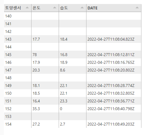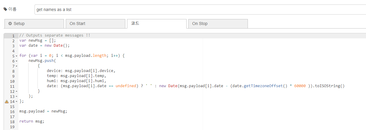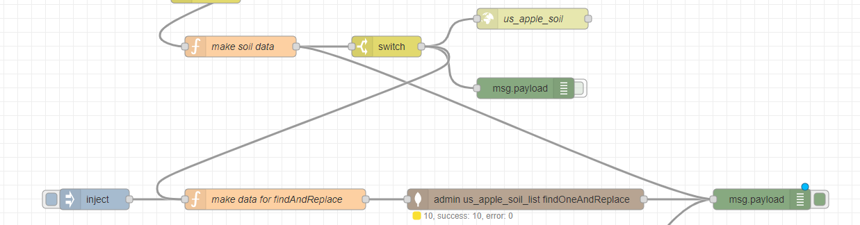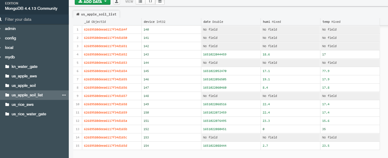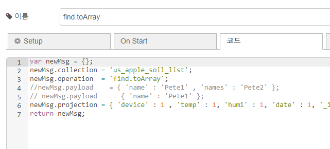 [{"id":"eca97310c7323217","type":"ui_table","z":"4037d292a5a4d2cb","group":"6c043ee02c40eb0a","name":"토양센서 리스트","order":14,"width":"9","height":9,"columns":[{"field":"device","title":"토양센서","width":"20%","align":"left","formatter":"plaintext","formatterParams":{"target":"_blank"}},{"field":"temp","title":"온도","width":"20%","align":"left","formatter":"plaintext","formatterParams":{"target":"_blank"}},{"field":"humi","title":"습도","width":"20%","align":"left","formatter":"plaintext","formatterParams":{"target":"_blank"}},{"field":"date","title":"DATE","width":"40%","align":"left","formatter":"plaintext","formatterParams":{"target":"_blank"}}],"outputs":0,"cts":false,"x":1280,"y":1280,"wires":[]},{"id":"bec649ac46ae5bae","type":"function","z":"4037d292a5a4d2cb","name":"get names as a list","func":"// Outputs separate messages !!\nvar newMsg = [];\nvar date = new Date();\n\nfor (var i = 0; i < msg.payload.length; i++) { \n newMsg.push(\n { \n device: msg.payload[i].device,\n temp: msg.payload[i].temp,\n humi: msg.payload[i].humi,\n date: (msg.payload[i].date == undefined) ? ' ' : new Date(msg.payload[i].date - (date.getTimezoneOffset() * 60000 )).toISOString()\n }\n ); \n};\n\nmsg.payload = newMsg;\n\nreturn msg;\n\n\n// for (var i = 0; i < msg.payload.length; i++) {\n// msg.payload.date = new Date(msg.payload.date - (date.getTimezoneOffset() * 60000 ))\n// .toISOString();\n// }\n \n// msg.payload.sort(function(a, b) {\n// return a.device - b.device;\n// });\n\n// return msg;\n","outputs":1,"noerr":0,"initialize":"","finalize":"","libs":[],"x":1030,"y":1240,"wires":[["eca97310c7323217","588ceca4a50187a2"]]},{"id":"588ceca4a50187a2","type":"debug","z":"4037d292a5a4d2cb","name":"","active":true,"tosidebar":true,"console":false,"tostatus":false,"complete":"payload","targetType":"msg","statusVal":"","statusType":"auto","x":1270,"y":1220,"wires":[]},{"id":"2ed99169fdc8c34e","type":"inject","z":"4037d292a5a4d2cb","name":"4) Output once only as a list","props":[{"p":"payload"},{"p":"topic","vt":"str"}],"repeat":"30","crontab":"","once":true,"onceDelay":"","topic":"","payload":"","payloadType":"str","x":440,"y":1140,"wires":[["63ab6cfbf18e2a79"]]},{"id":"63ab6cfbf18e2a79","type":"function","z":"4037d292a5a4d2cb","name":"find.toArray","func":"var newMsg = {};\nnewMsg.collection = 'us_apple_soil_list';\nnewMsg.operation = 'find.toArray';\n//newMsg.payload = { 'name' : 'Pete1' , 'names' : 'Pete2' };\n// newMsg.payload = { 'name' : 'Pete1' };\nnewMsg.projection = { 'device' : 1 , 'temp' : 1, 'humi' : 1, 'date' : 1, '_id' : 0 };\nreturn newMsg;","outputs":1,"noerr":0,"initialize":"","finalize":"","libs":[],"x":668,"y":1141,"wires":[["a24322578ab4b8b6"]]},{"id":"a24322578ab4b8b6","type":"mongodb2 in","z":"4037d292a5a4d2cb","service":"_ext_","configNode":"44fc0d6f.e1e8f4","name":"Mongo DB dynamic operation","collection":"","operation":"","x":910,"y":1140,"wires":[["bec649ac46ae5bae","588ceca4a50187a2"]]},{"id":"6c043ee02c40eb0a","type":"ui_group","name":"AWS","tab":"cdbff6416041a3fa","order":1,"disp":true,"width":"12","collapse":false,"className":""},{"id":"44fc0d6f.e1e8f4","type":"mongodb2","uri":"mongodb://127.0.0.1/mydb","name":"admin","options":"","parallelism":""},{"id":"cdbff6416041a3fa","type":"ui_tab","name":"의성 사과원","icon":"dashboard","order":6,"disabled":false,"hidden":true}]