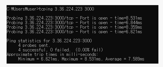 | e:\Downloads>tcping64 3.36.224.223 3000 |